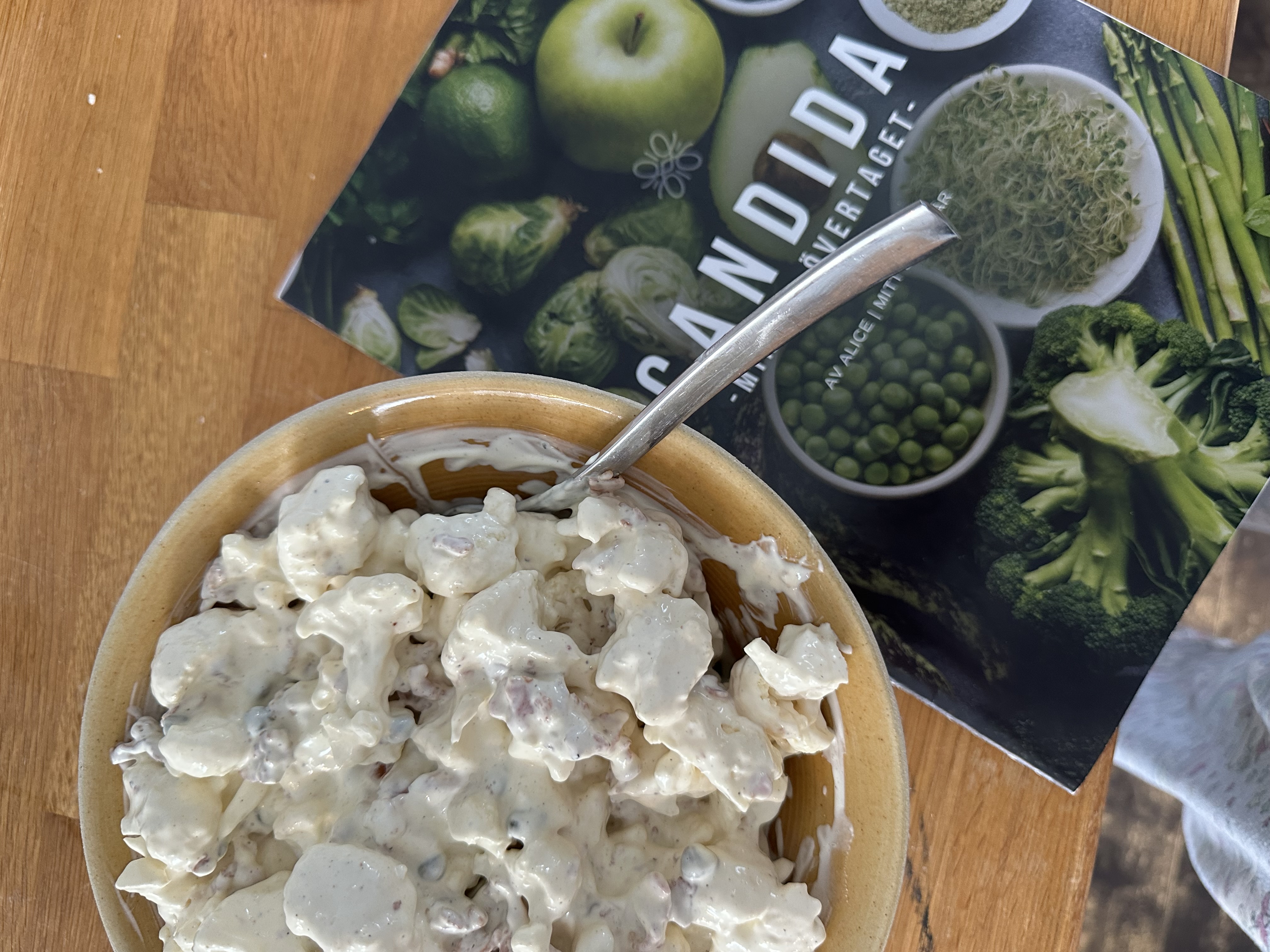Dela blomkålen i små buketter, tänk typ en munsbit liksom. Kaperstek baconet i små bitar. Sen blandar du ihop majonnäs med crème fraîche och dijon, här är det lite olika hur man vill att den ska smaka.