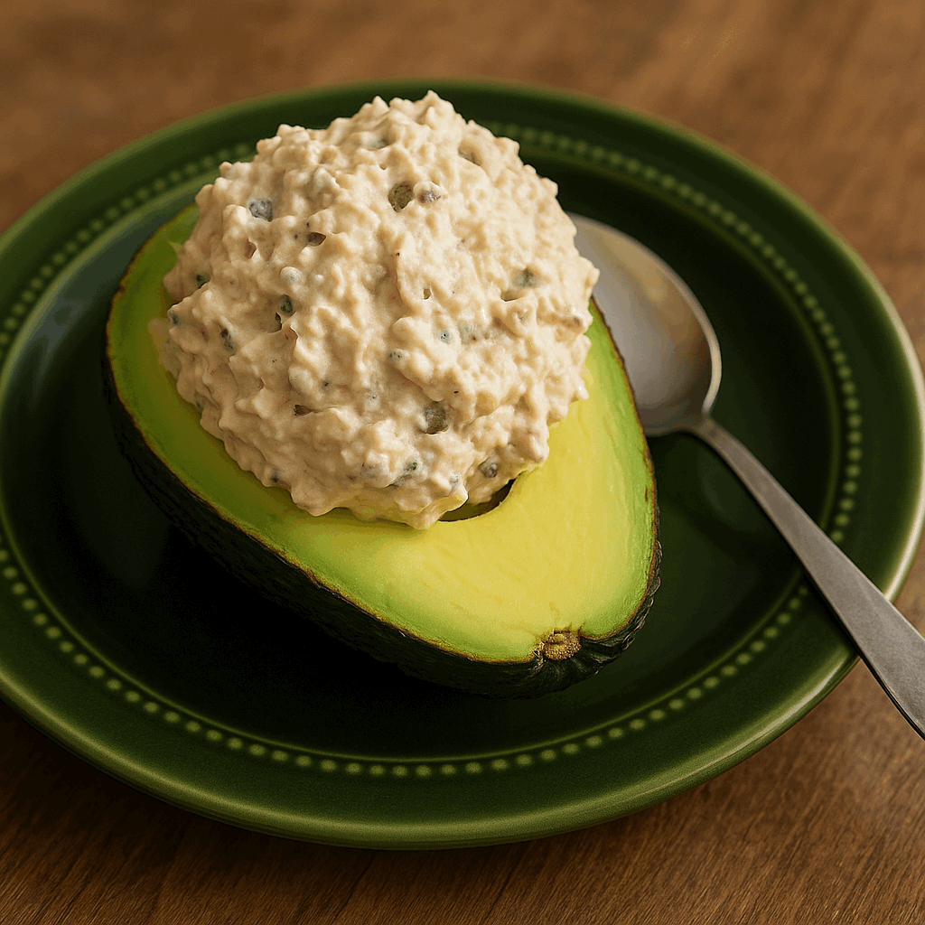 Rör ihop alla ingredienser och servera röran i en avokado. Kombon är oslagbar!